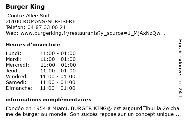 1 Burger King (Distance: 15,92 km) Rue Andre Boulle, 26000 Valence bar & gril, burger, king, restaurant américain, restaurant de hamburgers, restaurant familial, restaurant à emporter 3 King Jouet (Distance: 1,50 km) 51 Avenue des Allobroges, 26100 Romans jeux, jouet, jouets, king, magasin, peluches 4 ANTALYA Kebab-Tacos-Burger (Distance: 2,53 km) 4 Rue Jacquemart, 26100 Romans-sur-Isère antalya, burger, kebab, tacos 6 King Jouet (Distance: 12,98 km) - RN 532, 26320 Saint-Marcel-lès-Valence jeux, jouet, jouets, king, loisirs  |