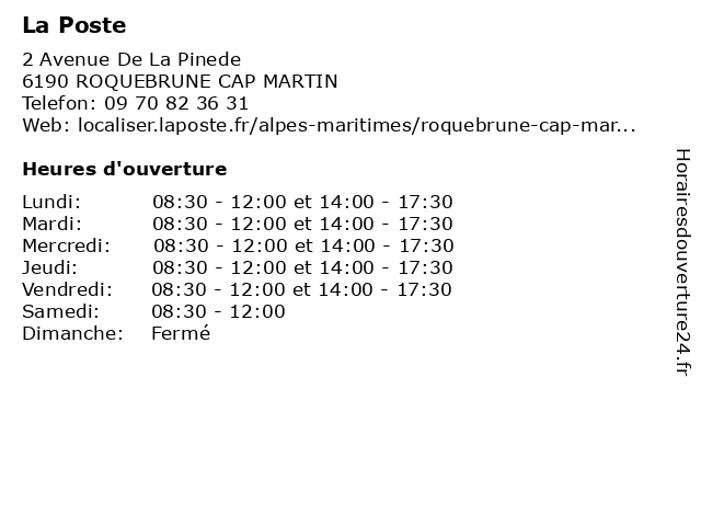 1 La Poste (Distance: 0,05 km) 2 Avenue de la Pinède, 06190 Roquebrune-Cap-Martin agence postale, courrier postal, expédition internationale, la, poste 2 La Poste (Distance: 3,59 km) 13 avenue de France, 06190 Roquebrune-Cap-Martin agence postale, courrier postal, expédition internationale, la, poste 3 La Poste (Distance: 3,94 km) 27 Avenue de Saint Roman, 06240 Beausoleil agence postale, courrier postal, expédition internationale, la, poste 4 La Poste (Distance: 5,91 km) 5 Boulevard des Moneghetti, 06240 Beausoleil agence postale, courrier postal, expédition internationale, la, poste 6 La Poste (Distance: 10,79 km) 45 Route departementale 2204, 06440 Blausasc agence postale, courrier postal, expédition internationale, la, poste |