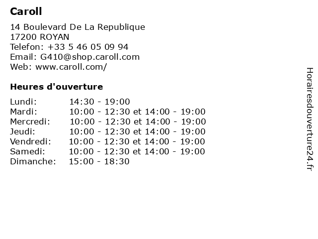 | Samedi | 10:00-12:30 et 14:00-19:00 |
