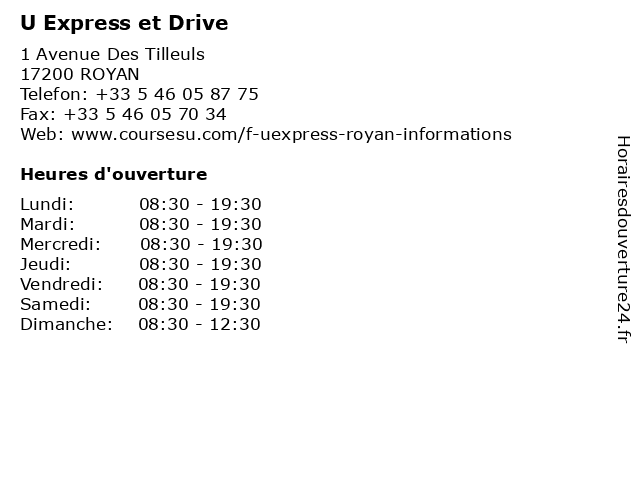 1 U Express et Drive (Distance: 3,13 km) Avenue des Hautes Folies, 17640 Vaux-sur-Mer drive, et, express 3 U Express et Drive (Distance: 9,28 km) 47 Rue de l'Église, 17132 Meschers-sur-Gironde drive, et, express 6 U Express Location (Distance: 0,03 km) 1 avenue des Tilleuls, 17200 Royan express, location, transport, utilitaire, véhicule |