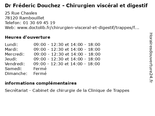 1 Dr Fréderic Douchez - Chirurgien viscéral et digestif (Distance: 19,15 km) 14 Rue Castiglione del Lago, 78190 Trappes chirurgie, chirurgien, digestif, douchez, dr, et, fréderic, general, soins, viscéral 2 Dr Philippe Chiche - Chirurgien viscéral et digestif - secrétariat (Distance: 0,53 km) 55 Rue Gambetta, 78120 Rambouillet chiche, chirurgien, digestif, dr, ecrétariat, et, médecins, médicaments, philippe, santé, secrétariat, spécialiste, viscéral 3 Dr Rossella Arena - Chirurgien viscéral et digestif (Distance: 1,08 km) 7 Rue Pierre et Marie Curie, 78120 Rambouillet arena, chirurgien, digestif, dr, et, médecins, médicaments, rossella, santé, secrétariat, spécialiste, viscéral 4 Dr Serge Brouzes - Chirurgien viscéral et digestif (Distance: 1,08 km) 7 Rue Pierre et Marie Curie, 78120 Rambouillet brouzes, chirurgien, digestif, dr, et, médecins, médicaments, santé, secrétariat, serge, spécialiste, viscéral 5 Dr Bogdan Cherciu - Chirurgien viscéral et digestif (Distance: 1,08 km) 7 Rue Pierre et Marie Curie, 78120 Rambouillet bogdan, cherciu, chirurgien, digestif, dr, et, médecins, médicaments, santé, secrétariat, spécialiste, viscéral 6 Dr Marine Humeau - Chirurgien viscéral et digestif (Distance: 1,08 km) 7 Rue Pierre et Marie Curie, 78120 Rambouillet chirurgien, digestif, dr, ecrétariat, et, humeau, marine, médecins, médicaments, santé, spécialiste, viscéral |