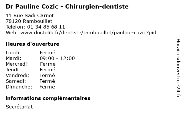 1 Dr Pauline Cozic - Chirurgien-dentiste (Distance: 9,36 km) 19 Rue du 11 Novembre, 78690 Les Essarts-le-Roi chirurgien, consultation, cozic, dentiste, docteur, dr, med, médecin, pauline, traitement 2 Pauline Rocchia - Ostéopathe (Distance: 13,49 km) 2 Rue de Maincourt, 78720 Dampierre-en-Yvelines ostéo, ostéopathe, ostéopathes, pauline, rocchia, soins 3 Pauline'S - Coiffeur Mixte & Barbier (Distance: 17,83 km) 5 place de la poste, 28700 Le Gué-de-Longroi barbier, beauté, coiffeur, coiffure, femmes, hommes, mixte, pauline's, salon, style 4 Pauline Labouise - Ostéopathe (Distance: 18,55 km) 10 Allée du Théâtre, 78190 Trappes cervicalgie, dorsalgie, kinésithérapeute, labouise, lombalgie, os, ostéopathe, pauline 5 Dr Pauline Lorin - Médecin généraliste (Distance: 22,56 km) 3 Rue du Fromenteau, 91940 Gometz-le-Châtel docteur, dr, generaliste, généraliste, lorin, medecin, médecin, pauline, soins 6 Pauline Riviere - Sage-femme (Distance: 23,40 km) 9 Rue Raoul Dautry, 91190 Gif-sur-Yvette femme, medical, pauline, riviere, sage, sagefemme |