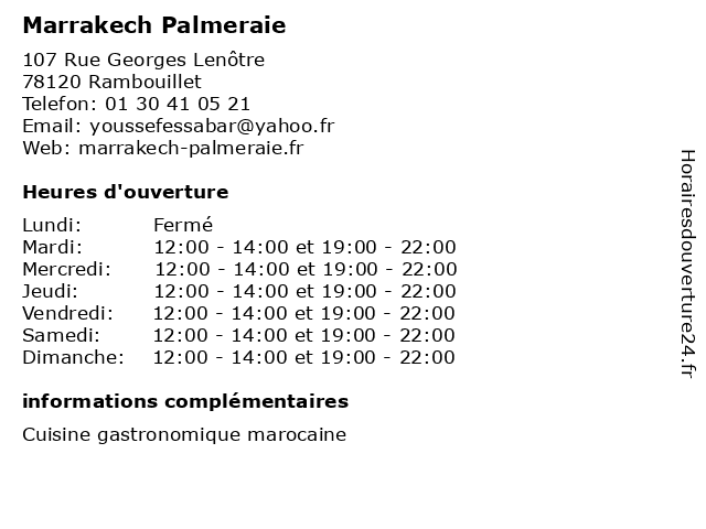 2 Le Marrakech (Distance: 34,66 km) 4 Rue Jean Maunoury, 28110 Luce boucheries, marrakech, poissonneries 3 La Tour de Marrakech (Distance: 37,12 km) 72 avenue Division Leclerc, 92160 Antony bistrot, de, la, marrakech, restaurant, tour 4 Anwal By La Tour De Marrakech (Distance: 38,48 km) 3 5, 92160 Antony anwal, by, marrakech, restaurants, tour 5 La Palmeraie (Distance: 38,81 km) 55 b Boulevard Henri Sellier, 92150 Suresnes aux, delices, marrakech, palmeraie, restaurants 6 Le Marrakech (Distance: 40,05 km) 149 t Avenue Du Marechal Foch, 78130 Les Mureaux marrakech, mogador, restaurants |
