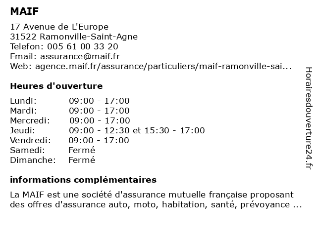 1 MAIF Assurances Ramonville Saint Agne (Distance: 0,00 km) 17 Avenue de l'Europe, 31520 Ramonville-Saint-Agne agne, assurances, maif, ramonville, saint 2 MAIF Assurances Toulouse (Distance: 6,50 km) 8 Rue d'Alsace Lorraine, 31000 Toulouse assurances, maif, toulouse 3 MAIF Toulouse Jean Jaurès (Distance: 6,78 km) 15 Allées Jean Jaurès, 31000 Toulouse jaurès, jean, maif, toulouse 4 MAIF Associations Collectivités Entreprises Toulouse (Distance: 12,98 km) 1 Rue Henri Matisse, 31700 Blagnac associations, collectivités, entreprises, maif, toulouse 5 Dekra Industrial (Distance: 7,68 km) 29 avenue Jean-François Champollion, 31037 Toulouse automobile, cetification, dekra, gestion, industrial, industrie, inspection, services, sinistres, transport 6 Harmonie Mutuelle (Distance: 8,28 km) Etage 2Eme, 31200 Toulouse assurance, harmonie, incendie, maritime, mutuelle, sinistres  |