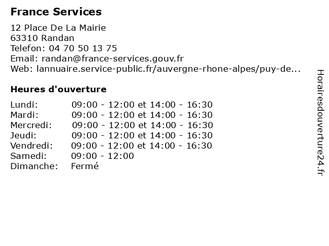 1 France Services (Distance: 5,85 km) - Route de Vendegre, 63350 Luzillat administration, communes, france, service, services, services publics 2 Mairie de Randan (Distance: 0,01 km) 11 place de la Mairie, 63310 Randan administration, assoc, associations, aux, bussières, d'information, de, des, dédié, greffe, information, local, locale, mairie, mission, personnes, point, randan, services, services publics 3 Mairie de Randan (Distance: 0,01 km) 11 place de la Mairie, 63310 Randan administration, assoc, associations, aux, bussières, d'information, de, des, dédié, greffe, information, local, locale, mairie, mission, personnes, point, randan, services, services publics 4 Mairie de Beaumont-lès-Randan (Distance: 0,04 km) 3 Rue de la Mairie, 63310 Beaumont-lès-Randan administration, beaumont, de, lès, mairie, publics, randan, services 5 France Matériaux - Seguin (Distance: 0,11 km) 2 Place de la Halle, 63310 Randan france, matériaux, seguin 6 France Hygiène Ventilation (Distance: 3,08 km) - Rue du Patural, 63310 Saint Denis Combarnazat entretien, france, hygiène, ventilation |