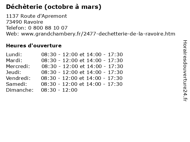 1 Déchèterie (octobre à mars) (Distance: 3,41 km) 92 Route de la Féclaz, 73230 Saint-Alban-Leysse bois, collecte, déchets, déchèterie, gravas, huiles, mars, octobre 2 Déchèterie (Eté) (Distance: 0,00 km) 1137 Route d'Apremont, 73490 La Ravoire avril, bois, collecte, déchets, déchèterie, eté, gravas, huiles, septembre 3 Office de Tourisme - De novembre à mars (Distance: 1,72 km) 1374 avenue de Chambéry, 73190 Challes-les-Eaux de, horaires des musées, mars, novembre, office, restaurants, tourisme, transports 4 Office de Tourisme - Avril à Octobre (Distance: 2,18 km) 1374 avenue de Chambéry, 73190 Challes-les-Eaux avril, d'avril, de, horaires des musées, octobre, office, restaurants, tourisme, transports 5 Evrard Horticulture - De novembre à mars (Distance: 5,24 km) 73 chemin Foray, 73160 Cognin de, evrard, fleurs, horticulture, jardin, mars, novembre, plantes, potagers, végétal 6 Déchèterie (Hiver) (Distance: 15,56 km) - sous la Gare, 73250 Saint-Pierre-d'Albigny collecte, déchets, déchèterie, détritus, gravats, hiver, tri |