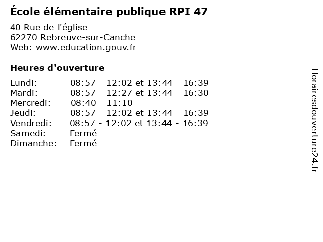 | Lundi | 08:57-12:02 et 13:44-16:39 |