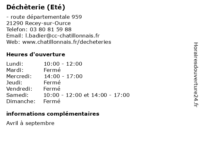 1 Déchèterie (Eté) (Distance: 11,91 km) - lieu-dit Combe Epachenet, 21510 Moitron avril, bennes, débarras, déchèterie, détritus, eté, ordures, poubelles, septembre 2 Déchèterie (Eté) (Distance: 17,88 km) - lieu-dit Les Buissons Marguerite, 21520 Courban avril, bennes, débarras, déchèterie, détritus, eté, ordures, poubelles, septembre 3 Déchèterie (Hiver) (Distance: 11,91 km) - lieu-dit Combe Epachenet, 21510 Moitron bennes, débarras, déchèterie, détritus, hiver, mars, octobre, ordures, poubelles 4 Déchèterie (Hiver) (Distance: 17,88 km) - lieu-dit Les Buissons Marguerite, 21520 Courban bennes, débarras, déchèterie, détritus, hiver, mars, octobre, ordures, poubelles 6 Trésor de Vix - Musée du Pays Châtillonais (du 1er septembre au 30 juin) (Distance: 23,36 km) 14 Rue de la Libération, 21400 Châtillon-sur-Seine 1er, 30, au, châtillonais, de, du, exposition, juin, musée, pays, septembre, trésor, visite, vix |