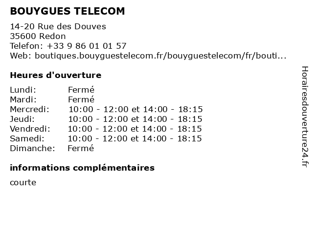 1 BOUYGUES TELECOM (Distance: 0,80 km) Avenue Jean Burel, 44460 Saint-Nicolas-de-Redon 5g, accessoires, acheter téléphone, apple, boutique bouygues telecom, bouygtel, bouygue, bouygue telecom, bouygues, bouygues telecom, bouygues telephone, bouygues télécom, bouyguestelecom, box internet, fibre, fibre optique, fixe, forfait mobile, fournisseur d'accès à internet, internet, internet haut débit, iphone, magasin bouygues, offres fixes, offres groupées, offres internet, opérateur, opérateur fixe, opérateur mobile, raccordement fibre optique haut débit (ftth), reprise mobile, réparation mobile, samsung, samsung galaxy, smartphones, telecom, télécommunication, téléphonie, téléphonie fixe, télévision 2 Coriolis Telecom (Distance: 2,83 km) 2 rue Jean Monnet, 35600 Redon coriolis, internet, smartphones, tablettes tactiles, telecom, télécom, téléphone, téléphones mobiles 3 Orange (Distance: 0,26 km) 50 Grande Rue, 35600 Redon accessories, connections, gadgets, internet, mobile, orange, phones, telecom, téléphonie 4 SFR (Distance: 0,26 km) 48 grande rue, 35600 Redon abonnements de téléphonie mobile ou fixe fixe ou carte prépayée, accès internet haut débit ou la fibre optique ainsi que des abonnements à des bouquets de chaînes de télévision ., sfr, téléphones mobiles 5 BOUYGUES TELECOM (Distance: 39,81 km) Rue de la Fontaine au Brun, 44570 Trignac bouygues, fai, fournisseur d'accès internet, telecom, téléphonie mobile 6 BOUYGUES TELECOM (Distance: 43,31 km) Rue de Villejames, 44350 Guérande bouygues, fai, fournisseur d'accès internet, telecom, téléphonie mobile |