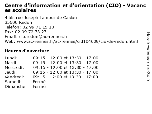 1 Centre d'information et d'orientation (CIO) (Distance: 0,00 km) 4 bis rue Joseph Lamour de Caslou, 35600 Redon centre, cio, collège, cours, d'information, d'orientation, enseignement, et, lycée, maternelle, nationale, orientation, primaire, privé, privée, public, publique, école, éducation, élémentaire 2 Point d'information local dédié aux personnes âgées (Distance: 0,42 km) 3 rue Charles-Sillard, 35600 Redon administration, aux, d'information, dédié, local, organismes, personnes, point, publics, redon, services, âgées 3 Espace Jeunes (Vacances Scolaires) (Distance: 6,23 km) - Place de la Mairie, 35600 Bains-sur-Oust activités, espace, jeunes, loisirs, scolaires, vacances 4 Espace Jeunes (Périodes Scolaires) (Distance: 15,82 km) 17 Rue des Forges, 44530 Saint-Gildas-des-Bois activités, espace, jeunes, loisirs, période, périodes, scolaire, scolaires 5 Espace Jeunes (Vacances Scolaires) (Distance: 15,82 km) 17 Rue des Forges, 44530 Saint-Gildas-des-Bois activités, espace, jeunes, loisirs, scolaires, vacances 6 Point Information Jeunesse (Distance: 15,82 km) 17 Rue des Forges, 44530 Saint-Gildas-des-Bois administration, assoc, information, jeunesse, point, services, services publics |