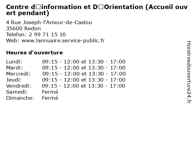 Termes de recherche pour Centre d’information et D’Orientation (Accueil ouvert pendant):et, administration, services, centre, accueil, services publics, ouvert, pendant, assoc, d’information, d’orientation |