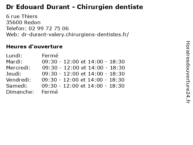1 Dr Valéry Durant - Chirurgien dentiste (Distance: 0,00 km) 6 rue Thiers, 35600 Redon chirurgien, dentaire, dentiste, dr, durant, implantologie, parodontologie, valéry 2 Dr Maxence Durant - Chirurgien dentiste (Distance: 0,00 km) 6 rue Thiers, 35600 Redon chirurgien, dentaire, dentiste, dr, durant, implantologie, maxence, parodontologie 5 Aquatic Club (le secrétariat durant les vacances) (Distance: 50,91 km) 17 rue Daniel Gilard, 56000 Vannes aquatic, club, durant, le, les, salle, secrétariat, sport, vacances 6 Bistrot St Edouard (Distance: 53,03 km) Galerie Cciale Leclerc Kerlann, 56000 Vannes bistrot, edouard, restaurants |