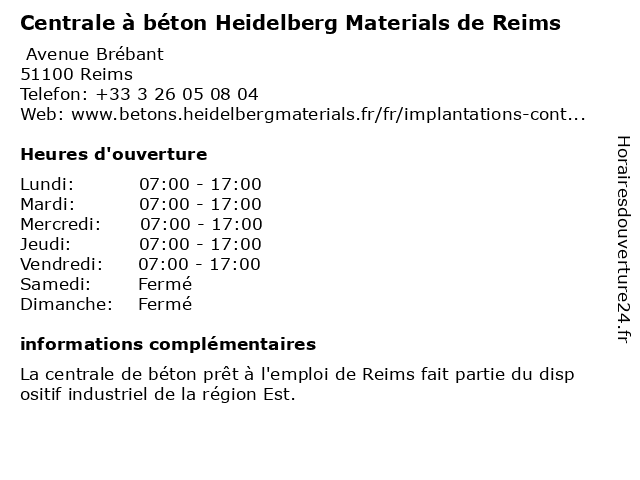 1 Centrale à béton Heidelberg Materials de Reims (Distance: 6,38 km) Boulevard du Val de Vesle, 51100 Reims béton, centrale, de, heidelberg, materials, reims 2 La Centrale de Financement (Distance: 1,65 km) 1 cours Jean-Baptiste Langlet, 51100 Reims centrale, crédit, de, financement, immobilier, la, prêt 3 Centrale Ambulance (Distance: 6,11 km) 47 Rue des Blancs Monts, 51350 Cormontreuil ambulance, centrale 5 Centrale à béton Heidelberg Materials d'Epernay (Distance: 22,49 km) 15 Rue du Pré Bréda, 51530 Mardeuil béton, centrale, d'epernay, heidelberg, materials 6 Centrale à béton Heidelberg Materials de Dormans (Distance: 33,50 km) Chemin de la Prairie, 51700 Dormans béton, centrale, de, dormans, heidelberg, materials |