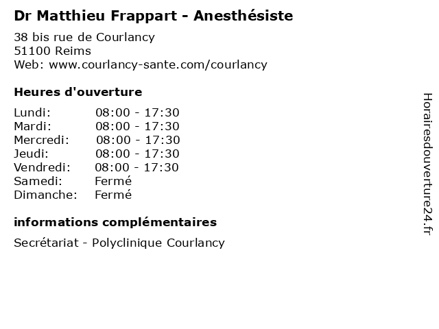 1 Dr Pierre Berthou - Anesthésiste (Distance: 0,00 km) 38 rue de Courlancy, 51100 Reims anesthesiste, anesthésiste, berthou, consultation, docteur, dr, med, médecin, médecine, pierre, traitement 2 Dr Fabienne Bourgeade - Anesthésiste (Distance: 0,00 km) 38 bis rue de Courlancy, 51100 Reims anesthésiste, bourgeade, consultation, docteur, dr, fabienne, med, médecin, médecine, traitement 3 Dr Catherine Castang - Anesthésiste (Distance: 0,00 km) 38 bis rue de Courlancy, 51100 Reims anesthésiste, castang, catherine, consultation, docteur, dr, med, médecin, médecine, traitement 4 Dr Audrey Mariscal-Causse - Anesthésiste (Distance: 0,00 km) 38 bis rue de Courlancy, 51100 Reims anesthésiste, audrey, causse, consultation, docteur, dr, mariscal, med, médecin, médecine, traitement 5 Dr Hervé Dayawa - Anesthésiste (Distance: 0,00 km) 38 bis rue de Courlancy, 51100 Reims anesthesiste, anesthésiste, consultation, dayawa, docteur, dr, hervé, med, médecin, médecine, traitement 6 Dr Jérôme Delcourt - Anesthésiste (Distance: 0,00 km) 38 bis rue de Courlancy, 51100 Reims anesthesiste, anesthésiste, consultation, delcourt, docteur, dr, jérôme, med, médecin, médecine, traitement |