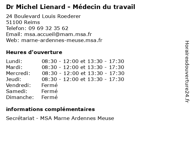 1 Dr Antoine Charbonneaux - Médecin du travail (Distance: 0,00 km) 24 Boulevard Louis Roederer, 51100 Reims antoine, charbonneaux, consultation, docteur, dr, du, med, médecin, traitement, travail 2 Dr Philippe Delalieux - Médecin du travail (Distance: 0,00 km) 24 Boulevard Louis Roederer, 51100 Reims consultation, delalieux, docteur, dr, du, med, médecin, philippe, traitement, travail 3 Dr Christine Ferrari - Médecin du travail (Distance: 0,00 km) 24 Boulevard Louis Roederer, 51100 Reims christine, consultation, docteur, dr, du, ferrari, med, médecin, traitement, travail 4 Dr Yvon Gabignon - Médecin du travail (Distance: 0,00 km) 24 Boulevard Louis Roederer, 51100 Reims consultation, docteur, dr, du, gabignon, med, médecin, traitement, travail, yvon 5 Assurance Retraite et Santé au Travail (Distance: 0,72 km) 1 Rue de l'Arbalète, 51000 Reims administration, assoc, assurance, au, et, retraite, santé, services, services publics, travail 6 Dr Christian Fessard - Médecin du travail (Distance: 2,89 km) 45 Rue Cognacq Jay, 51100 Reims christian, consultation, docteur, dr, du, fessard, med, medecine, medical, médecin, traitement, travail |