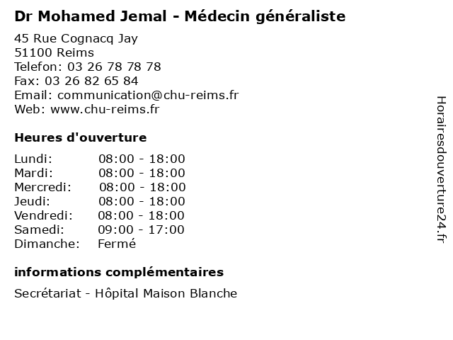 1 Dr Mohamed-Faouzi Smati - Anesthésiste (Distance: 0,59 km) - Rue Du General Koenig, 51100 Reims anesthésiste, consultation, docteur, dr, faouzi, med, mohamed, médecin, smati, traitement 2 Lassoued Mohamed Ben Ali (Distance: 1,00 km) 19 Boulevard Louis Barthou, 51100 Reims ali, ben, lassoued, mohamed, restaurants 3 Dr Mohamed Boukarai - Cardiologue (Distance: 2,16 km) 24-44 Rue du Colonel Fabien, 51100 Reims bleuets, boukarai, cardiologique, cardiologue, de, docteur, dr, et, generaliste, les, medical, mohamed, pneumologique, polyclinique, réadaptation, service, soin 4 Dr Mohamed Laib - Chirurgien-dentiste (Distance: 3,67 km) 80 Rue De Cernay, 51100 Reims chirurgien, dentaire, dentiste, dr, implantologie, laib, mohamed, parodontologie 5 Dr Mohamed El Ouaraki - Angiologue (Distance: 3,82 km) 35 Boulevard Carteret, 51100 Reims angiologue, cabinet, dr, el, medical, mohamed, ouaraki, secretariat, traitements, vasculaires 6 Dr Mohamed Abla - Médecin généraliste (Distance: 4,43 km) 48 rue de Sébastopol, 51100 Reims abla, consultation, docteur, dr, généraliste, med, mohamed, médecin, traitement |