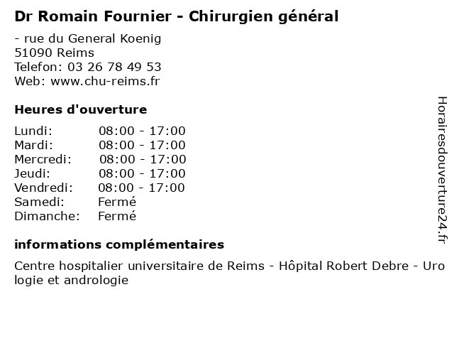 1 Dr Ricky Tambwe Kayombo - Chirurgien général (Distance: 0,00 km) - rue du General Koenig, 51090 Reims chirurgien, consultation, docteur, dr, général, kayombo, med, médecin, médecine, ricky, tambwe, traitement 2 Dr Charlotte Behets - Chirurgien général (Distance: 0,00 km) - Rue Du General Koenig, 51100 Reims behets, charlotte, chirurgien, consultation, docteur, dr, général, med, médecin, traitement 3 Dr Claude Clement - Chirurgien général (Distance: 0,00 km) - Rue Du General Koenig, 51100 Reims chirurgien, claude, clement, consultation, docteur, dr, général, med, médecin, traitement 4 Dr Ana Diaz Cives - Chirurgien général (Distance: 0,00 km) - Rue Du General Koenig, 51100 Reims ana, chirurgien, cives, consultation, diaz, docteur, dr, général, med, médecin, traitement 5 Medecin Benoit Vrielynck (Chirurgien général) (Distance: 3,50 km) 5 Boulevard de la Paix, 51100 Reims benoit, chirurgien, docteur, général, medecin, sante, services, vrielynck 6 ERDF ARE Champagne-Ardenne Service clients (général - particuliers) (Distance: 3,89 km) 3 Rue des Romains, 51100 Reims agences, ardenne, are, champagne, clients, electricite, energie, erdf, général, particuliers, service, services |