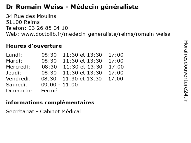 | Jeudi | 08:30-11:30 et 13:30-17:00 |