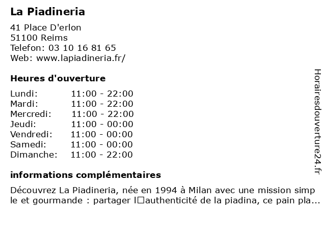 1 Piperno Reims (Distance: 0,07 km) 52 Place Drouet D'erlon, 51100 Reims piperno, reims, restaurant italien 2 Restaurant La Villa (Distance: 0,49 km) 30 Rue de Mars, 51100 Reims cuisine, gastronomie, italien, la, restaurant, restauration, villa 3 Pizza la Mama (Distance: 1,28 km) 134 Boulevard Saint-Marceaux, 51100 Reims café, italien, la, mama, pizza, pizzas, pizzeria, restaurant, restauration 4 Uno Pizza (Distance: 1,30 km) 38 Rue de Cernay, 51100 Reims café, italien, pizza, pizzas, pizzeria, restaurant, restauration, uno 5 Andiamo Fast Food (Distance: 1,35 km) 74 Rue Emile Zola, 51100 Reims andiamo, café, fast, food, italien, pizzas, pizzeria, restaurant, restauration 6 Coco Pizzas (Distance: 3,93 km) 12 Place des Fleurs, 51450 Betheny café, coco, italien, pizzas, pizzeria, restaurant, restauration |