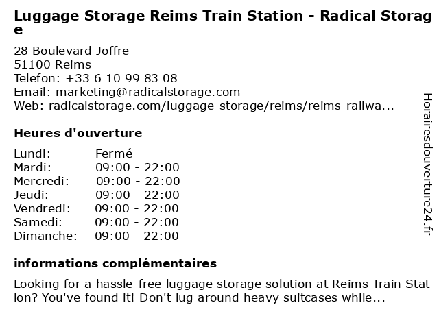 1 Luggage Storage Reims Train Station - Radical Storage (Distance: 0,31 km) 87 Place Drouet dErlon 511, 51100 Reims luggage, luggage storage, luggage storage near me, radical, reims, station, storage, train 2 Nannybag Luggage Storage (Distance: 0,02 km) 28 Boulevard Joffre, 51100 Reims luggage, nannybag, storage 4 Nannybag Luggage Storage (Distance: 0,84 km) 28 Rue Des Capucins, 51100 Reims luggage, nannybag, storage 6 Nannybag Luggage Storage (Distance: 1,00 km) 104 Rue Émile Zola, 51100 Reims luggage, nannybag, storage |