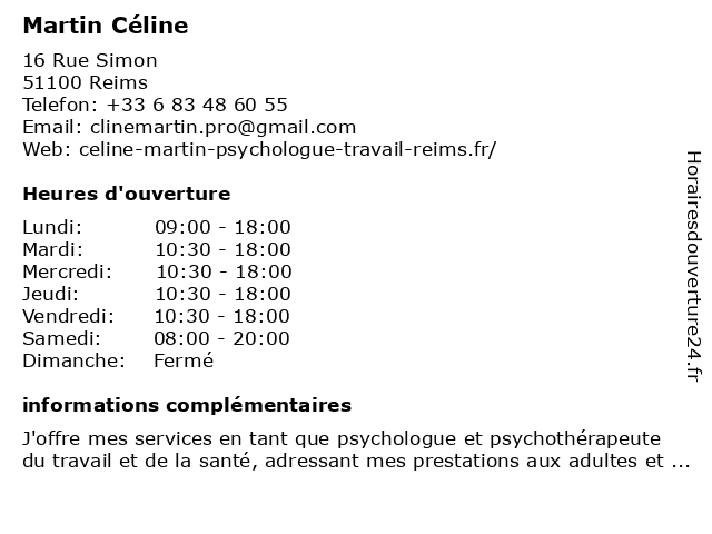 1 Office Notarial - Jamman, Morel & Conreur-Martin (Distance: 0,97 km) 34 A boulevard Paix, 51100 Reims actes notariés, conreur, frédérique, jamman, martin, morel, notaires, notarial, office, office notarial, étude notariale 2 Céline Pierrat Ottawa - Sage-femme (Distance: 1,56 km) 38 bis rue de Courlancy, 51100 Reims celine, consultation, céline, docteur, dr, femme, med, médecin, ottawa, pierrat, sage, traitement 3 École maternelle publique Martin Peller (Distance: 1,66 km) 14 Rue Passe Demoiselles, 51100 Reims cours, education, martin, maternelle, peller, publique, services, École, école 4 École élémentaire publique Martin Peller (Distance: 1,66 km) 14 Rue Passe Demoiselles, 51100 Reims cours, education, martin, peller, publique, services, École, école, élémentaire 5 Dr Emmanuelle Martin-Brichet - Médecin généraliste (Distance: 1,67 km) 1 Rue Emile Cazier, 51100 Reims brichet, consultation, docteur, dr, emmanuelle, généraliste, martin, med, médecin, traitement 6 Dr Sandrine Martin - Médecin généraliste (Distance: 2,22 km) - Rue Du General Koenig, 51100 Reims consultation, docteur, dr, généraliste, martin, med, médecin, sandrine, traitement |