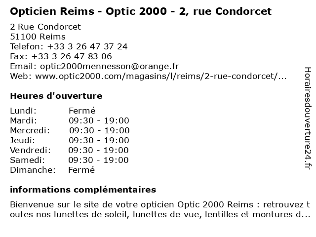 Termes de recherche pour Opticien Reims - Optic 2000 - 2, rue Condorcet:reims, rue, opticien, lunettes de soleil, optic2000, 2000, optic, lentilles de contact, condorcet, lunettes de vue, opticien optic2000, ray-ban, rayban |