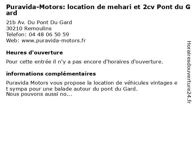 | Appeler Puravida-Motors: location de mehari et 2cv Pont du Gard | |
