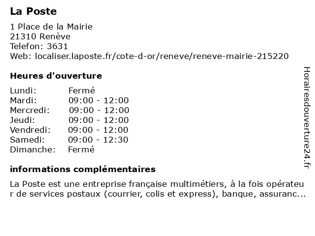 1 La Poste (Distance: 4,79 km) 4 Place de l'Eglise, 21310 Champagne-sur-Vingeanne agence, assurance, banque, banque postale, bureau de poste, chronopost, colis, courrier, dps, expéditions internationales, la, point, postale, poste, relais, timbres, téléphonie, ups, western union 3 La Poste (Distance: 11,12 km) - Rue de l'Église, 70100 Nantilly express chronopost, la, poste, réexpédition internationale 5 La Poste (Distance: 11,25 km) 2 rue du Général Charnotet, 70100 Autrey-lès-Gray agence, assurance, banque, banque postale, bureau de poste, chronopost, colis, courrier, dps, expéditions internationales, la, point, postale, poste, relais, timbres, téléphonie, ups, western union 6 La Poste (Distance: 11,60 km) - Rue du Mont, 21310 Belleneuve express chronopost, la, poste, réexpédition internationale |