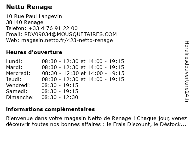 1 Netto Station Service (Distance: 0,05 km) 180 Rue du 8 Mai 1945, 38140 Renage carburant, essences, gazole, netto, service, services, station 2 Netto La Cote St Andre (Distance: 19,70 km) 45 Avenue Aristide Briand, 38260 La Côte-Saint-André andre, cote, la, netto, st 3 Netto Station Service (Distance: 24,18 km) - Route de Saint Laurent du Pont, 38380 Entre-deux-Guiers carburant, essences, gazole, netto, service, services, station 6 |