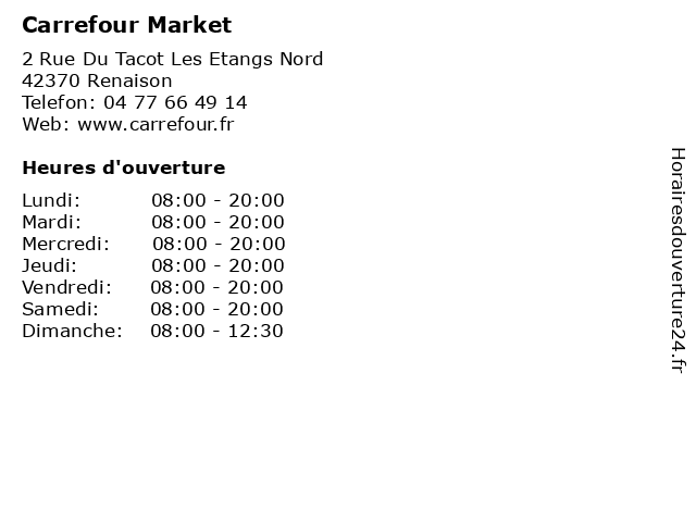 1 Carrefour Market (Distance: 8,52 km) 53 Rue Jules Faron, 42153 Riorges alimentation, carrefour, magasin discount, market, supermarché 3 Carrefour Market (Distance: 10,85 km) . Rue Alexandre Raffin, 42300 Roanne carrefour, hypermarche, marche, market 4 Carrefour Market (Distance: 12,84 km) 7 Les Plaines, 42120 Le Coteau alimentation, carrefour, magasin discount, market, supermarché 5 Carrefour Station Service (Distance: 0,26 km) 2 Rue du Tacot, 42370 Renaison carburant, carrefour, essences, gazole, service, services, station 6 Carrefour Drive Market (Distance: 8,38 km) 53 Rue Jules Faron, 42153 Riorges carrefour, drive, hypermarche, marche, market |