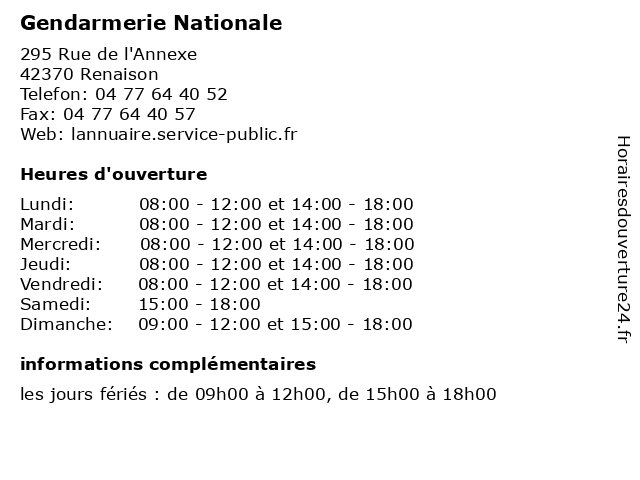 1 Gendarmerie Nationale (Distance: 11,26 km) 650 Rue de Montagny, 42300 Villerest brigade, commandant, communauté, gendarme, gendarmerie, nationale, proximité, sécurité 2 Gendarmerie Nationale (Distance: 14,39 km) - Route de Vivans, 42310 La Pacaudière brigade, commandant, communauté, gendarme, gendarmerie, nationale, proximité, sécurité 3 Gendarmerie Nationale (Distance: 16,44 km) 10 Route de Montloup, 42430 Saint-Just-en-Chevalet brigade, commandant, communauté, gendarme, gendarmerie, nationale, proximité, sécurité 4 Gendarmerie Nationale (Distance: 20,85 km) 16 Rue de Ferrières, 03250 Le Mayet-de-Montagne brigade, commandant, communauté, gendarme, gendarmerie, nationale, proximité, sécurité 5 Gendarmerie Nationale (Distance: 31,75 km) 11 Boulevard Jean Jaurès, 03120 Lapalisse brigade, commandant, communauté, gendarme, gendarmerie, nationale, proximité, sécurité 6 Gendarmerie Nationale (Distance: 34,55 km) 7a Avenue Honoré Préveraud, 03130 Le Donjon brigade, commandant, communauté, gendarme, gendarmerie, nationale, proximité, sécurité |