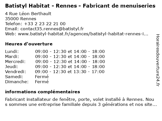 | 1 Agence Pasquet Menuiseries (Distance: 0,65 km) 139 Rue de Lorient, 35000 Rennes agence, menuiseries, pasquet 2 Habitat Clean Elagage (Distance: 0,74 km) 5 Rue du Manoir de Servigné, 35000 Rennes clean, elagage, habitat 3 Square Habitat (Distance: 2,47 km) 3 rue Louis Braille, 35136 SAINT JACQUES DE LA LANDE habitat, listings, properties, real estate, rent, rental management, square 4 Square Habitat Rennes (Distance: 3,60 km) 39 Boulevard de la Liberté, 35000 Rennes habitat, rennes, square 5 Menuiseries Vérandas Armor (Distance: 3,88 km) 7 Rue de la Barberais, 35650 Le Rheu armor, menuiseries, vérandas 6 Habitalia Menuiseries (Distance: 7,36 km) 47 route du meuble, 35520 Chapelle-des-Fougeretz art, dinan, fenêtres, habitalia, menuiseries |