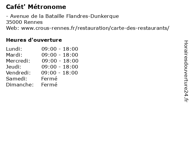 1 RU Le Métronome (Distance: 0,00 km) - Avenue de la Bataille Flandres-Dunkerque, 35000 Rennes cafétéria, le, métronome, restaurant, ru, universitaire 2 Cafet' Langues - Cafét' Hall B (Distance: 0,19 km) - Place Recteur Henri le Moal, 35000 Rennes cafet', cafét', cafétéria, hall, langues, restaurant, universitaire 3 Cafet' Langues - Cafét' Pôle langues (Distance: 0,19 km) - Place Recteur Henri le Moal, 35000 Rennes cafet', cafét', cafétéria, langues, pôle, restaurant, universitaire 4 Cafét' Santé (Distance: 0,59 km) 2 avenue Léon Bernard, 35700 Rennes cafét', cafétéria, restaurant, santé, universitaire 5 RU et Cafét' La Harpe - Resto U (Distance: 0,59 km) 36 Avenue Winston Chuchill, 35000 Rennes cafét', cafétéria, et, harpe, la, restaurant, resto, ru, universitaire 6 RU et Cafét' La Harpe - Cafét (Distance: 0,59 km) 36 Avenue Winston Chuchill, 35000 Rennes cafét, cafét', cafétéria, et, harpe, la, restaurant, ru, universitaire |
