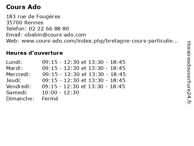 | Lundi | 09:15-12:30 et 13:30-18:45 |