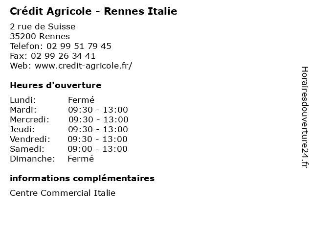 1 Crédit Agricole - Rennes Saint-Martin (Distance: 0,00 km) 157 Rue de Saint-Malo, 35000 Rennes agence, agricole, argent, assurance, bancaire, banque, banquier, conseil, crédit, finances, financier, martin, pret, rennes, saint 2 Crédit Agricole - Rennes Bourg-l'Évêque (Distance: 0,00 km) 6 bis rue de Brest, 35000 Rennes agence, agricole, argent, assurance, bancaire, banque, banquier, bourg, conseil, crédit, finances, financier, l'Évêque, pret, rennes 3 Crédit Agricole - Rennes Liberté (Distance: 0,00 km) 16 Boulevard de la Liberté, 35000 Rennes agence, agricole, argent, assurance, bancaire, banque, banquier, conseil, crédit, finances, financier, liberté, pret, rennes 4 Crédit Agricole - Rennes Hoche (Distance: 0,21 km) 12 Place Hoche, 35000 Rennes agence, agricole, argent, assurance, bancaire, banque, banquier, conseil, crédit, finances, financier, hoche, pret, rennes 5 Crédit Agricole - Rennes Opéra (Distance: 0,78 km) 4 Rue d'Orléans, 35000 Rennes agence, agricole, argent, assurance, bancaire, banque, banquier, conseil, crédit, finances, financier, opéra, pret, rennes 6 Crédit Agricole - Rennes La Monnaie (Distance: 0,79 km) 5 Rue de la Monnaie, 35000 Rennes agence, agricole, argent, assurance, bancaire, banque, banquier, conseil, crédit, finances, financier, la, monnaie, pret, rennes |