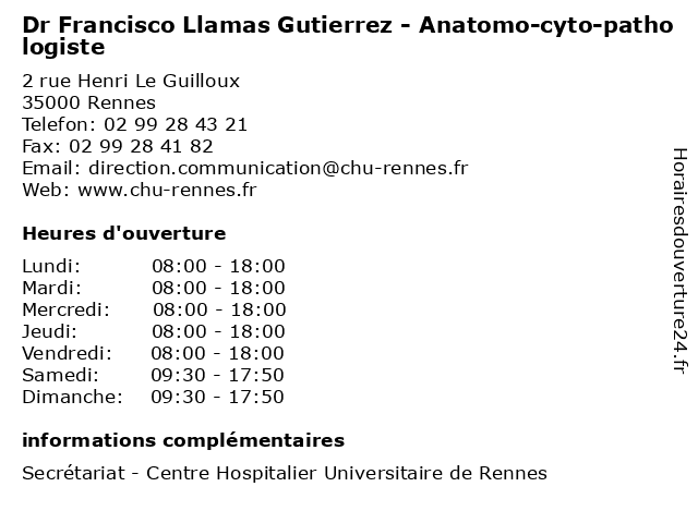 1 Dr Aurèlie Cauchois - Anatomo-cyto-pathologiste (Distance: 0,00 km) 2 rue Henri Le Guilloux, 35000 Rennes anatomo, aurelie, aurèlie, cauchois, consultation, cyto, docteur, dr, med, médecin, pathologiste, traitement 2 Dr Dan Cristian Chiforeanu - Anatomo-cyto-pathologiste (Distance: 0,00 km) 2 rue Henri Le Guilloux, 35000 Rennes anatomo, chiforeanu, consultation, cristian, cyto, dan, docteur, dr, med, médecin, pathologiste, traitement 3 Dr Sebastien Henno - Anatomo-cyto-pathologiste (Distance: 0,00 km) 2 rue Henri Le Guilloux, 35000 Rennes anatomo, consultation, cyto, docteur, dr, henno, med, médecin, pathologiste, sebastien, traitement 4 Dr Solene-Florence Kammerer-Jacquet - Anatomo-cyto-pathologiste (Distance: 0,00 km) 2 rue Henri Le Guilloux, 35000 Rennes anatomo, consultation, cyto, docteur, dr, florence, jacquet, kammerer, med, médecin, pathologiste, solene, traitement 5 Dr François Le Gall - Anatomo-cyto-pathologiste (Distance: 0,00 km) 2 rue Henri Le Guilloux, 35000 Rennes anatomo, consultation, cyto, docteur, dr, francois, françois, gall, le, med, médecin, pathologiste, traitement 6 Dr Cécile Le Naoures-Mear - Anatomo-cyto-pathologiste (Distance: 0,00 km) 2 rue Henri Le Guilloux, 35000 Rennes anatomo, cecile, consultation, cyto, cécile, docteur, dr, le, mear, med, médecin, naoures, pathologiste, traitement |