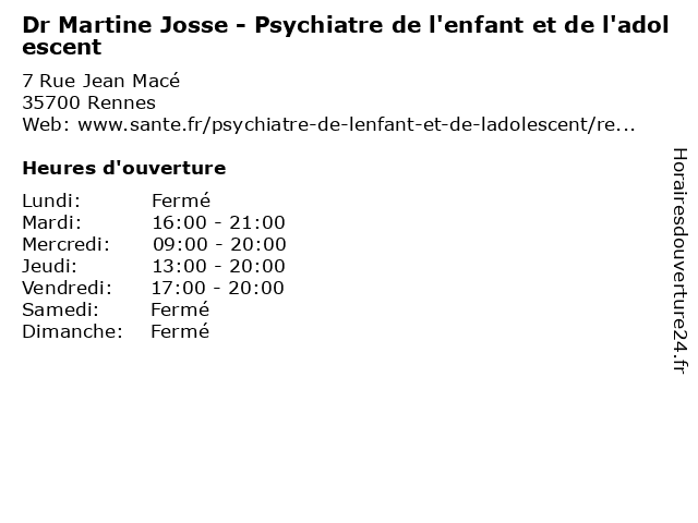 1 Dr Michel Morin - Psychiatre (Distance: 0,29 km) 2 Rue Broussais, 35000 Rennes dr, folie, michel, morin, psychiatre, psychiatrie, psychiatrique 2 Dr Albert Louppe - Psychiatre de l'enfant et de l'adolescent (Distance: 1,32 km) 78 Rue Saint Helier, 35000 Rennes albert, de, dr, et, l'adolescent, l'enfant, louppe, psy, psychiatre, sante, soins 3 CMP Petite Enfance Capucine - CATTP de l'Enfant et de l'Adolescent (Distance: 1,40 km) 43 Square de la Mettrie, 35000 Rennes capucine, cattp, cmp, de, enfance, et, l'adolescent, l'enfant, petite 4 CMP - Centre Médico Psychologique de l'Enfant POMDAPI (Distance: 2,09 km) 8 Rue du Bois Perrin, 35000 Rennes centre, cmp, de, l'enfant, médico, pomdapi, psychologique 5 Centre Médico Psychologique de l'Enfant - Centre Petite Enfance et Adolescent Villejean (Distance: 2,62 km) 9 Avenue du Doyen Collas, 35000 Rennes adolescent, centre, de, enfance, et, l'enfant, médico, petite, psychologique, villejean 6 La Sauvegarde de l'Enfant à l'Adulte en Ille-et-Vilaine - SEA 35 (Distance: 2,88 km) - Parc de la Bretèche, 35760 Saint-Grégoire 35, adulte, association, de, en, enfant, et, ille, l'adulte, l'enfant, la, sauvegarde, sea, vilaine |