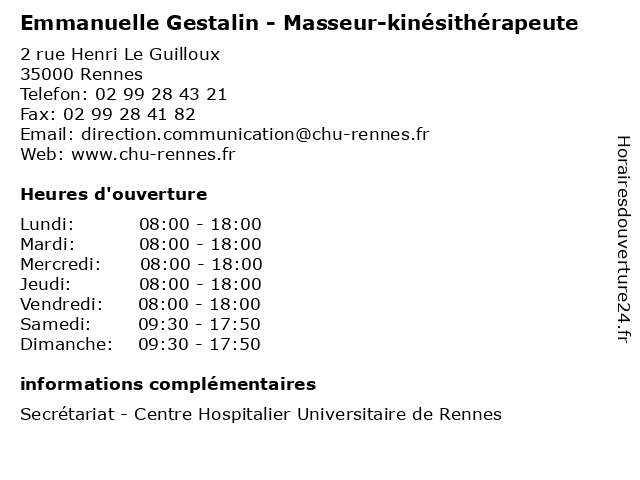 1 Dr Emmanuelle Le Page - Neurologue (Distance: 0,00 km) 2 rue Henri Le Guilloux, 35000 Rennes consultation, docteur, dr, emmanuelle, le, med, médecin, neurologue, page, traitement 2 Boutique Emmanuelle (Distance: 1,13 km) 7 rue Leperdit, 35000 Rennes accessoires, bijoux, boutique, emmanuelle, prêt à porter 4 Dr Emmanuelle Cabon - Radiologue (Distance: 2,55 km) 4 Place Saint-Guénolé, 35000 Rennes cabon, consultation, docteur, dr, emmanuelle, med, médecin, médecine, radiologue, traitement 5 Dr Emmanuelle Cabon - Radiologue (Distance: 2,73 km) 236 bis rue de Nantes, 35136 Saint-Jacques-de-la-Lande cabon, consultation, docteur, dr, emmanuelle, med, médecin, médecine, radiologue, traitement 6 Dr Emmanuelle Cabon - Radiologue (Distance: 2,76 km) 6 Boulevard de la Boutière, 35760 Saint-Grégoire cabon, consultation, docteur, dr, emmanuelle, med, médecin, médecine, radiologue, traitement |