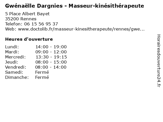 1 Maître Gwénaëlle Durand Pasquier - Avocate (Distance: 2,41 km) 2 Rue de la Mabilais, 35000 Rennes avocate, avocats, cabinet, conseils, contentieux, durand, gwénaëlle, juridique, justice, litiges, maître, pasquier, services 3 Gwénaëlle Grimoin - Sophrologue (Distance: 6,79 km) 8 Rue de Jouanet, 35700 Rennes grimoin, gwénaëlle, medecin, sante, sophro, sophrologue 4 Maître Gwénaëlle Troude - Avocate (Distance: 7,30 km) 6 place des Arcades, 35510 Cesson-Sevigne avocate, avocats, civils, droits, gwénaëlle, juridiques, maître, troude 5 Solenn Chojnicki - Masseur-kinésithérapeute (Distance: 0,00 km) 5 Place Albert Bayet, 35200 Rennes chojnicki, docteur, kine, kinesitherapeute, kinésithérapeute, masseur, solenn 6 Solenn Chojnicki - Masseur-kinésithérapeute (Distance: 0,00 km) 5 Place Albert Bayet, 35200 Rennes chojnicki, docteur, kinésithérapeute, masseur, médecin, médecine, secrétariat, solenn |