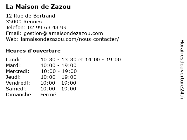 | Lundi | 10:30-13:30 et 14:00-19:00 |