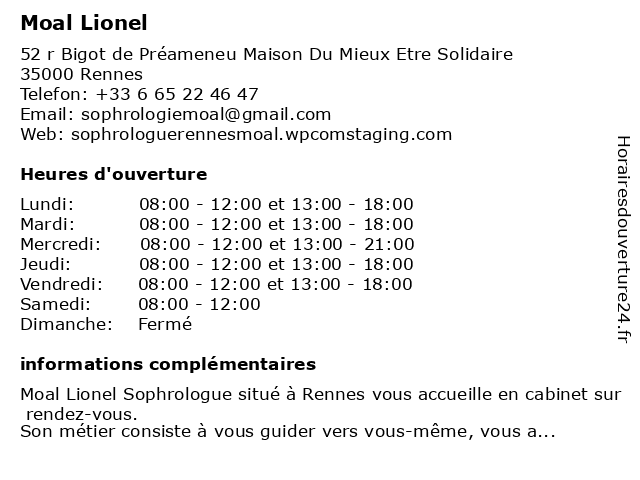 | Lundi | 08:00-12:00 et 13:00-18:00 |