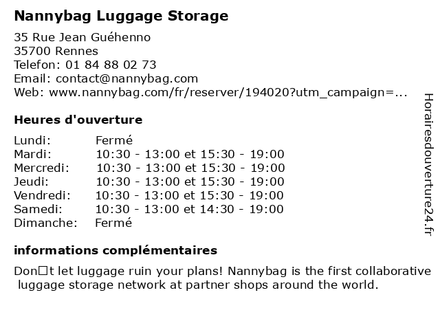 1 Nannybag Luggage Storage (Distance: 0,76 km) 7 Place Des Lices, 35000 Rennes luggage, nannybag, storage 2 Nannybag Luggage Storage (Distance: 1,34 km) 6 Rue Du Puits Mauger, 35000 Rennes luggage, nannybag, storage 3 Nannybag Luggage Storage (Distance: 1,49 km) 81 Alphonse Guerin, 35000 Rennes luggage, nannybag, storage 4 Nannybag Luggage Storage (Distance: 1,51 km) 53 Mail François Mitterrand, 35000 Rennes luggage, nannybag, storage 5 Nannybag Luggage Storage (Distance: 1,52 km) 24 Passage Du Trégor, 35000 Rennes luggage, nannybag, storage 6 Nannybag Luggage Storage (Distance: 1,66 km) 15 Rue De Châtillon, 35000 Rennes luggage, nannybag, storage |