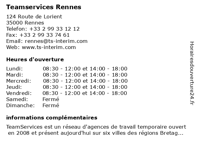 TeamServices est un réseau d'agences de travail temporaire ouvert en 2008 et présent aujourd'hui sur six villes des régions Bretagne et Pays de la Loire: Rennes (35), Lorient (56), Quimper (29) ...