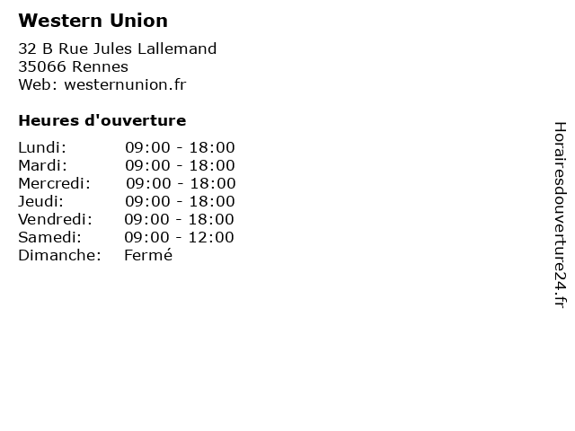 1 Western Union (Distance: 1,26 km) 66 Mail Francois Mitterrand, 35000 Rennes centre de remmittance, l'argent, transfert d'argent, union, western 2 Western Union (Distance: 1,88 km) 8 Rue Du Puits Mauger, 35000 Rennes centre de remmittance, l'argent, transfert d'argent, union, western 3 Western Union (Distance: 1,91 km) 23 Quali Lamennais, 35000 Rennes centre de remmittance, l'argent, transfert d'argent, union, western 4 Western Union (Distance: 2,04 km) 27 Boulevard Du Colombier, 35000 Rennes centre de remmittance, l'argent, transfert d'argent, union, western 5 Western Union (Distance: 2,24 km) 1 Rue Vincent Auriol, 35000 Rennes centre de remmittance, l'argent, transfert d'argent, union, western 6 Western Union (Distance: 3,68 km) 129 Rue De Fougeres, 35700 Rennes centre de remmittance, l'argent, transfert d'argent, union, western |