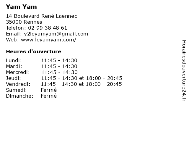 1 Agence Yam (Distance: 1,14 km) 4 Rue Beaumanoir, 35000 Rennes agence, communication, design, entreprise, informatique, solution, web, yam 2 Yamaha Planète Yam Concessionnaire (Distance: 4,26 km) 16 Rue Jean le Ho, 35000 Rennes concessionnaire, planète, yam, yamaha 3 Pret A Manger (Distance: 0,84 km) 19 Place de la Gare, 35005 Rennes barista, brunch, café, cuisine équilibrée, dessert, jus, manger, petit déjeuner, plat chaud, pret, pâtes, salades, sandwiches, thé, végétarien 4 Le Bun Bo de Maman (Distance: 0,91 km) 58 Rue Saint-Malo, 35000 Rennes asiatique, bo, bun, de, le, maman, rapide, restaurant, restauration, vietnam, vietnamienne 5 La Saigonnaise (Distance: 0,91 km) 14 Rue Saint-Malo, 35000 Rennes asiatique, la, restaurant, restauration, saigonnaise, vietnam, vietnamien, vietnamienne 6 Monsieur Yak (Distance: 1,18 km) 10 Rue de la Chalotais, 35000 Rennes asiatique, cuisine, monsieur, restaurant, restauration, thai, thailandais, yak |