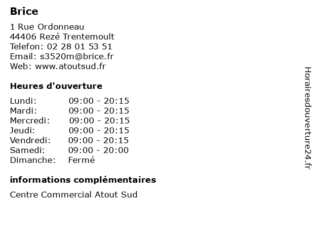 1 BRICE (Distance: 1,32 km) n/a Avenue du Maréchal, 44400 Rezé accessories, brice, coat, costume, jacket, polo, shirt, sweater, t-shirt 2 Brice (Distance: 1,89 km) 1 Route De Pornic, 44400 Reze accessoires, bijoux, brice, chaussures, homme, mode femme, restaurant, services 3 Brice (Distance: 4,74 km) - Boulevard Salvador Allende, 44800 Saint-Herblain accessoires, brice, homme, magasin, vêtements 4 Brice (Distance: 5,39 km) . Rue James Cook, 44800 Saint-Herblain beaute, bijoux, brice, chaussures, etam, lingerie, maison, mode enfant, mode femme, mode homme, restaurant, sport 5 BRICE (Distance: 5,55 km) n/a NANTES, 44800 Saint-Herblain accessories, brice, coat, costume, jacket, polo, shirt, sweater, t-shirt 6 Brice (Distance: 6,28 km) 8 Avenue des Thebaudieres, 44800 Saint-Herblain beaute, bijoux, brice, chaussures, etam, lingerie, maison, mode enfant, mode femme, mode homme, restaurant, sport |