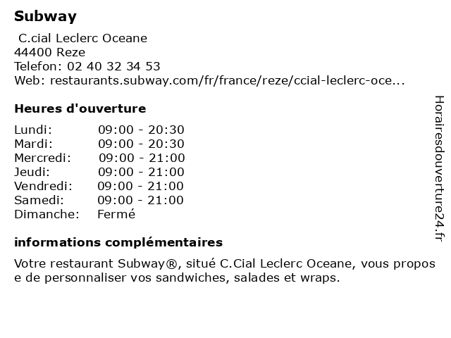 1 Subway (Distance: 1,66 km) . Boulevard du Général de Gaulle, 44000 Nantes beaute, bijoux, chaussures, etam, lingerie, maison, mode enfant, mode femme, mode homme, restaurant, sport, subway 2 Subway (Distance: 4,96 km) 21 Bd De La Prairie Au Duc, 44000 Nantes fast-food, restaurant à emporter, restaurants, subway 3 Subway (Distance: 5,03 km) Cc Carrefour Beaulieu, 44000 Nantes fast-food, restaurant à emporter, restaurants, subway 4 Subway (Distance: 5,14 km) 6 Rue Du Docteur Zamenhoff, 44000 Nantes rapide, restaurant, restauration, subway 5 Subway (Distance: 5,54 km) 2 rue Pierre Mendès France, 44230 Saint Sébastien sur Loire rapide, restaurant, restauration, subway 6 Subway (Distance: 5,54 km) Subway Centre Commercial Auchan, 44230 Saint Sebastien Sur Loire ariane, restaurants, subway |