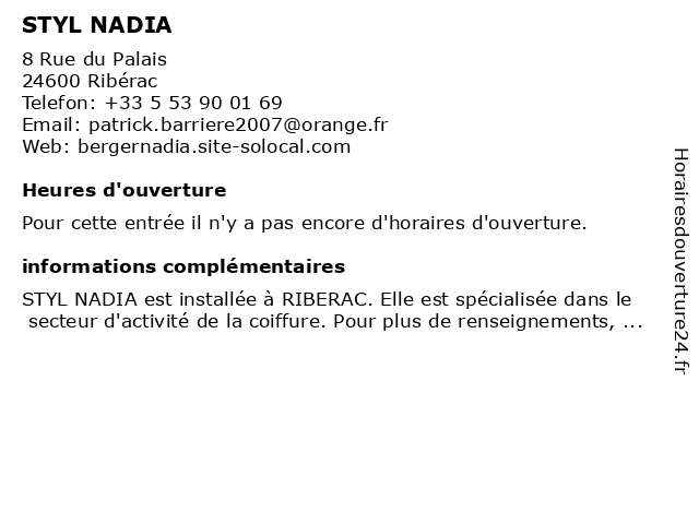 | 2 Styleco (Distance: 41,19 km) 26 Avenue Jules Ferry, 24300 Nontron accessoires, centre, divers, habillement, magasins, styl, styleco 3 Dr Nadia Bourayou - Médecin généraliste (Distance: 45,79 km) - Rond-Point de Girac, 16000 Angoulême bourayou, consultation, docteur, dr, généraliste, med, médecin, nadia, traitement 4 Anne Marie Styl Coiffure (Distance: 45,82 km) 24 Rue Junien Rabier, 24100 Bergerac anne, coiffure, marie, styl 5 Le Plaisir De Manger (Distance: 46,32 km) 70 Rue Victor Hugo, 33220 Sainte Foy La Grande manger, nadia, plaisir, restaurants, tarri 6 |