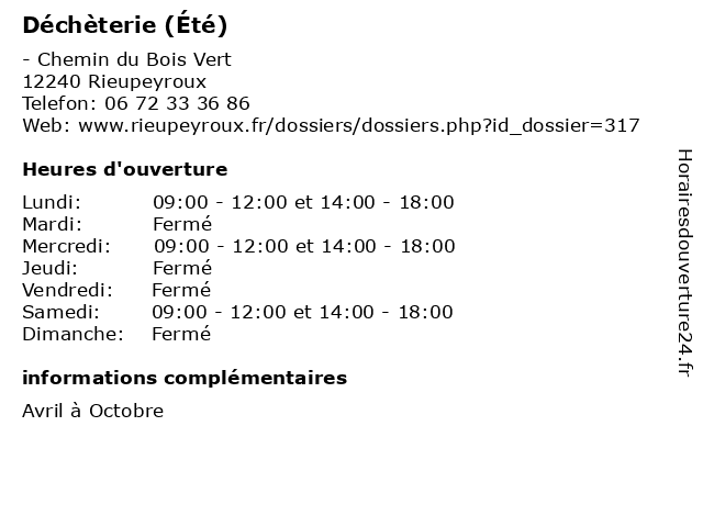 1 Déchèterie (Été) (Distance: 11,35 km) - lieu-dit Pont de l'Alzou, 12390 Rignac bennes, collecte, déchets, déchèterie, détritus, gravats, tri, été 2 Déchèterie (Hiver) (Distance: 0,00 km) - Chemin du Bois Vert, 12240 Rieupeyroux bennes, collecte, déchets, déchèterie, détritus, gravats, hiver, tri 3 Déchèterie (Hiver) (Distance: 11,35 km) - lieu-dit Pont de l'Alzou, 12390 Rignac bennes, collecte, déchets, déchèterie, détritus, gravats, hiver, tri 4 Déchèterie (Distance: 12,44 km) - Zone d’Activités de l’Issart, 12800 Naucelle bennes, collecte, déchets, déchèterie, détritus, gravats, tri 5 Déchèterie (Distance: 15,42 km) - Zone d’Activités de Marengo, 12160 Baraqueville bennes, collecte, déchets, déchèterie, détritus, gravats, tri 6 Déchèterie (Distance: 17,37 km) - Avenue Gabriel Soulie, 12200 Villefranche-de-Rouergue bennes, collecte, déchets, déchèterie, détritus, gravats, tri |