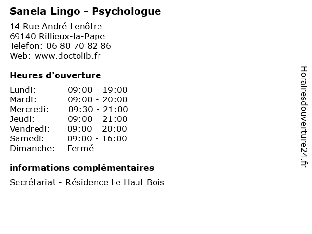 1 Dr Thierry Balais - Psychiatre (Distance: 0,84 km) - Allée Alain Mimoun, 69140 Rillieux-la-Pape balais, dr, folie, psychiatre, psychiatrie, psychiatrique, thierry 2 Léonor Gardin-Morin - Psychologue (Distance: 1,14 km) 65 rue des Contamines, 69140 Rillieux-la-Pape consultation, docteur, gardin, léonor, med, morin, médecin, médecine, psychologue, traitement 3 Raphael Betito - Psychologue (Distance: 2,36 km) 98 Avenue Général de Gaulle, 69300 Caluire-et-Cuire betito, folie, psychiatre, psychiatrie, psychiatrique, psychologue, raphael 4 Dr Marine Favre - Psychiatre (Distance: 3,91 km) 1 Rue Pierre Termier, 69660 Collonges-au-Mont-d’Or dr, favre, folie, marine, psychiatre, psychiatrie, psychiatrique 5 Dr Laurence Beauvir - Psychiatre (Distance: 4,30 km) - Rue Jean-Baptiste Perret, 69450 Saint-Cyr-Au-Mont-d'Or beauvir, consultation, docteur, dr, laurence, med, medecine, medical, médecin, psychiatre, traitement 6 Dr Aziz Bellahmer - Psychiatre (Distance: 4,30 km) - Rue Jean-Baptiste Perret, 69450 Saint-Cyr-Au-Mont-d'Or aziz, bellahmer, consultation, docteur, dr, med, medecine, medical, médecin, psychiatre, traitement |